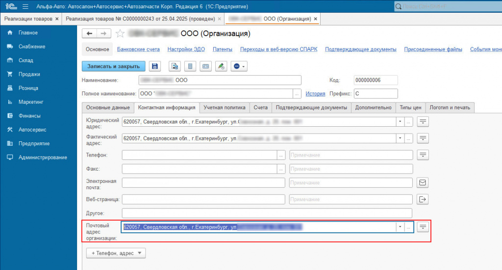 Рис. 1. Автоматически добавленный расширением "Почтовы адрес" справочника "Организации"