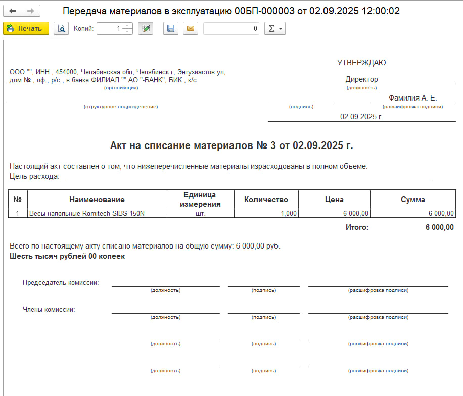 Внешняя печатная форма Акт на списание материалов для документа "Передача материалов в эксплуатацию" конфигурации Бухгалтерия предприятия 3.0.