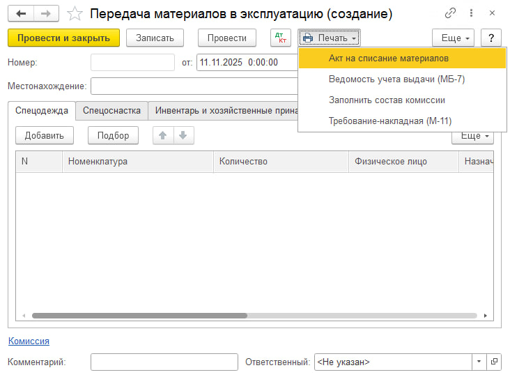 впф акт списание спецодежда инвентарь материал печатная форма передача