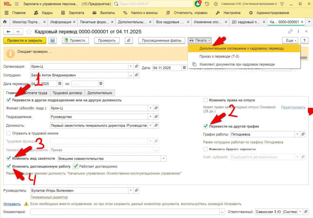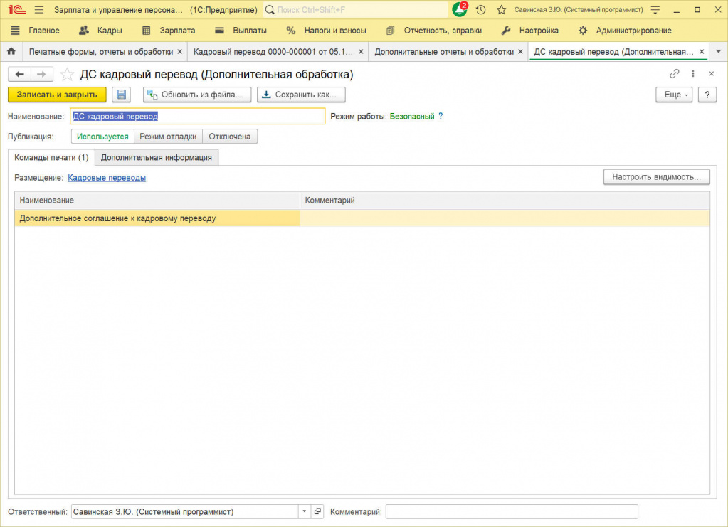 Обратите внимание, что форма учитывает только перечисленные значения и только в документе Кадровый перевод. Иными словами - остальное можно интуитивно понятным образом адаптировать для себя самостоятельно.