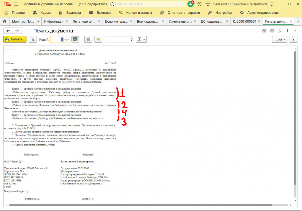 Позволяет печатать форму "Дополнительное соглашение" из документа "Кадровый перевод".