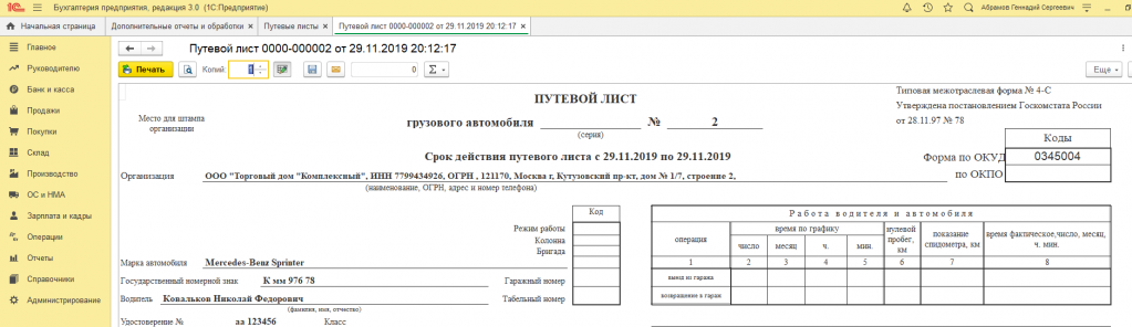 В документе "Путевой лист" не предусмотрена печатная форма путевого листа грузового автомобиля по форме №4-С. Макет и процедуры необходимые для формирования перенесены в обработку, что позволяет быстро отредактировать ее под свои потребности.