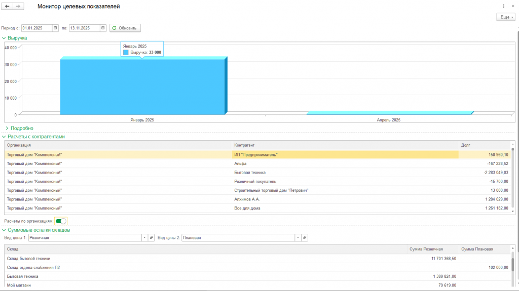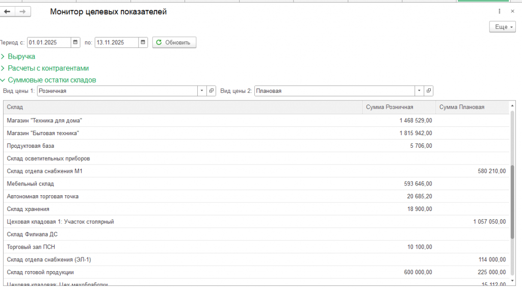 Обработка покажет выручку по месяцам, информацию по расчетам с клиентами и поставщиками, суммовые остатки на складах по видам цен.
