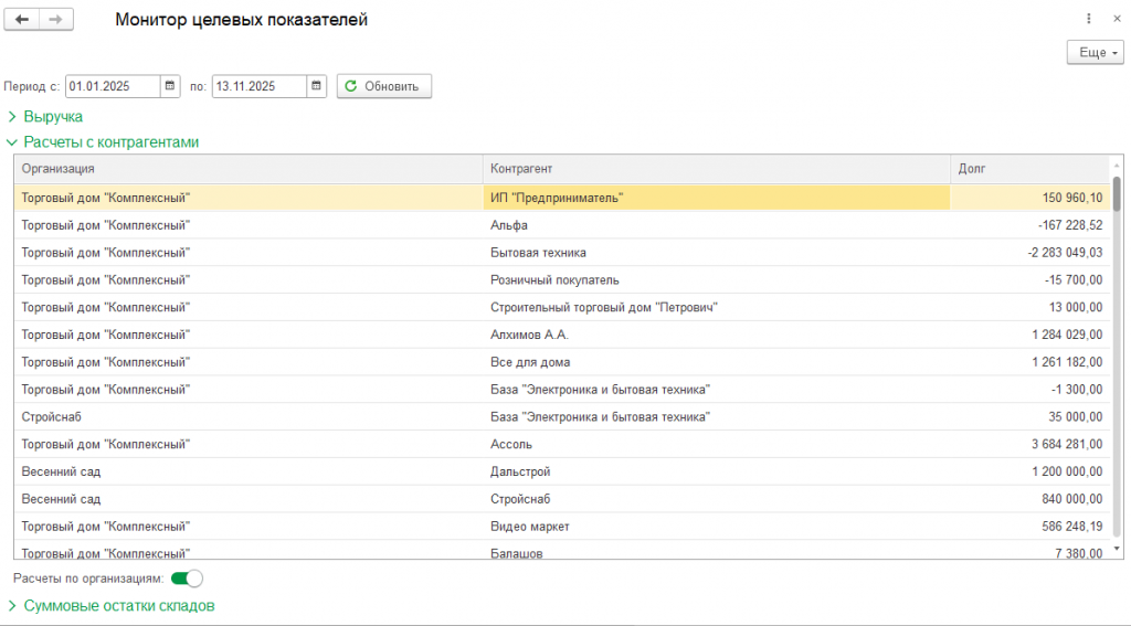 Информацию по расчетам с клиентами и поставщиками в разрезе организаций, при отключенной галочки "Расчеты по организациям" будет отображаться общая задолженность по всем организациям.