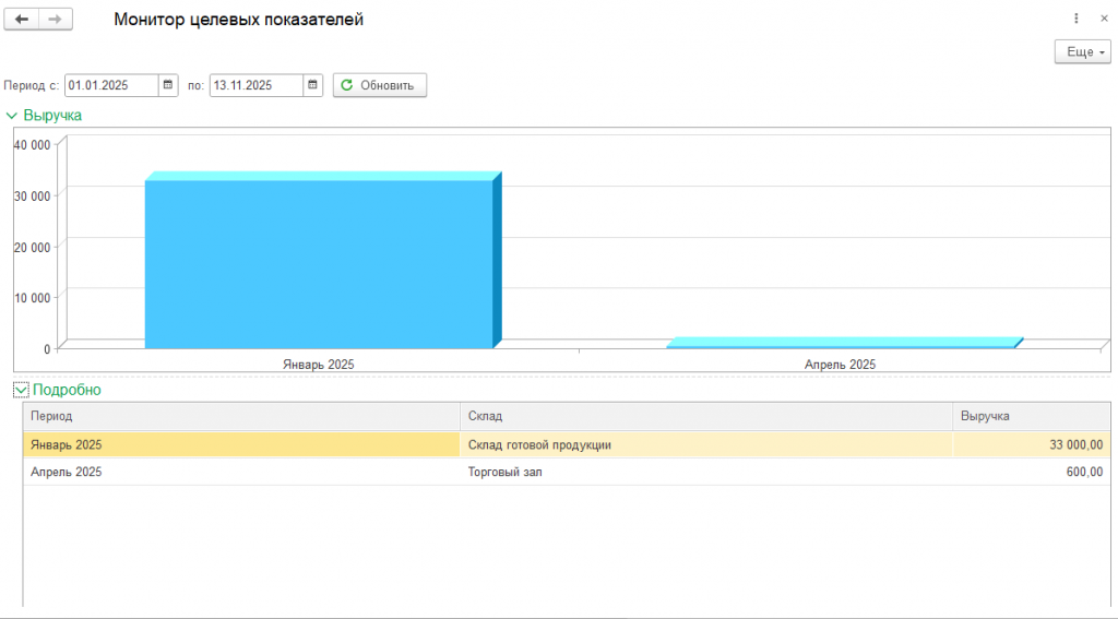 Информацию о выручке по месяцам на диаграмме и подробно в таблице в разрезе складов.