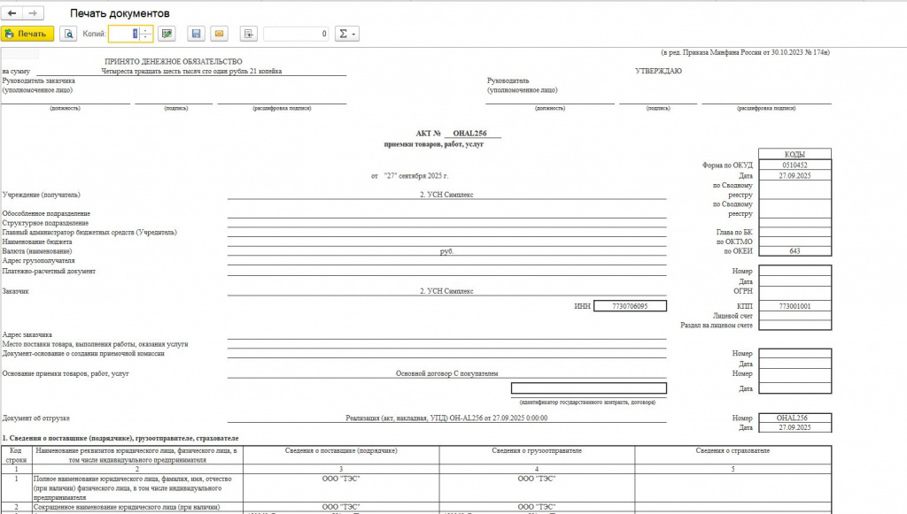 Представляю готовую внешнюю печатную форму для программ 1С, предназначенную для автоматического формирования - Акт приемки товаров, работ, услуг по актуальной редакции Приказа Минфина России от 30.10.2023 №174н. Для кого это решение? Для бухгалтеров и IT-специалистов компаний, которые используют 1С. Для разработчиков 1С, ищущих готовое, работоспособное решение для своих проектов.