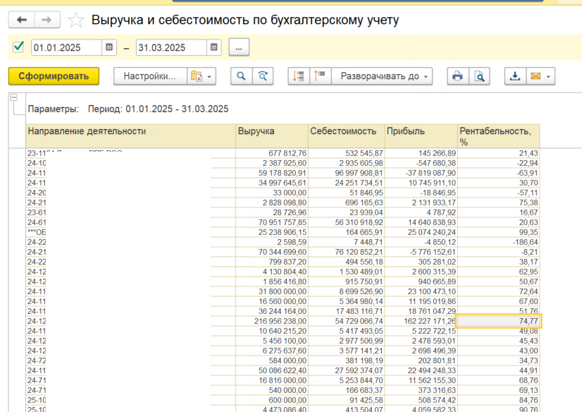 Отчет по регистру бухгалтерии, выводящий в разрезе направлений деятельности суммы выручки, себестоимости, прибыли и рентабельности в процентах.
