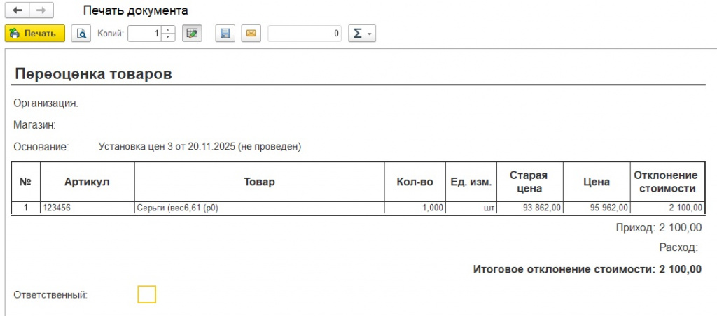 Печатная форма переоценки товаров по магазину с отклонением цен для Розница 3
