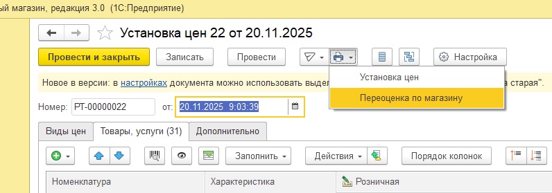 В Рознице 2.3 была возможность из документа Установка цен распечатать форму переоценки с указанием магазина. Программа отбирала из товаров, указанных в Установке цен, только те, которые есть на остатке в указанном магазине, и выводила эти товары в печатную форму с указанием отклонения новой цены от старой. При переходе на версию Розница 3 бухгалтеру этой формы очень не хватало.