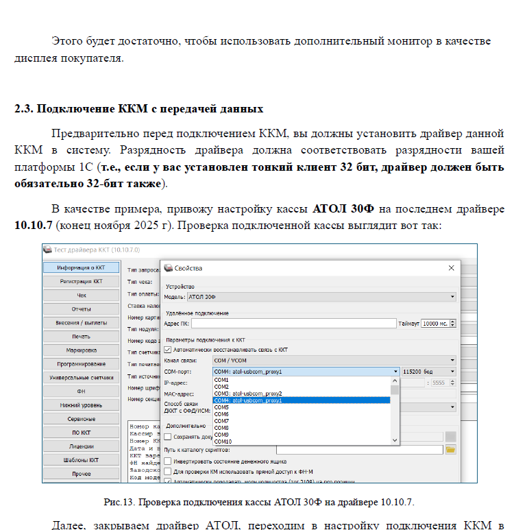 Рис.1 Пример настройки подключения ККМ через драйвер АТОЛ 10.10.7.