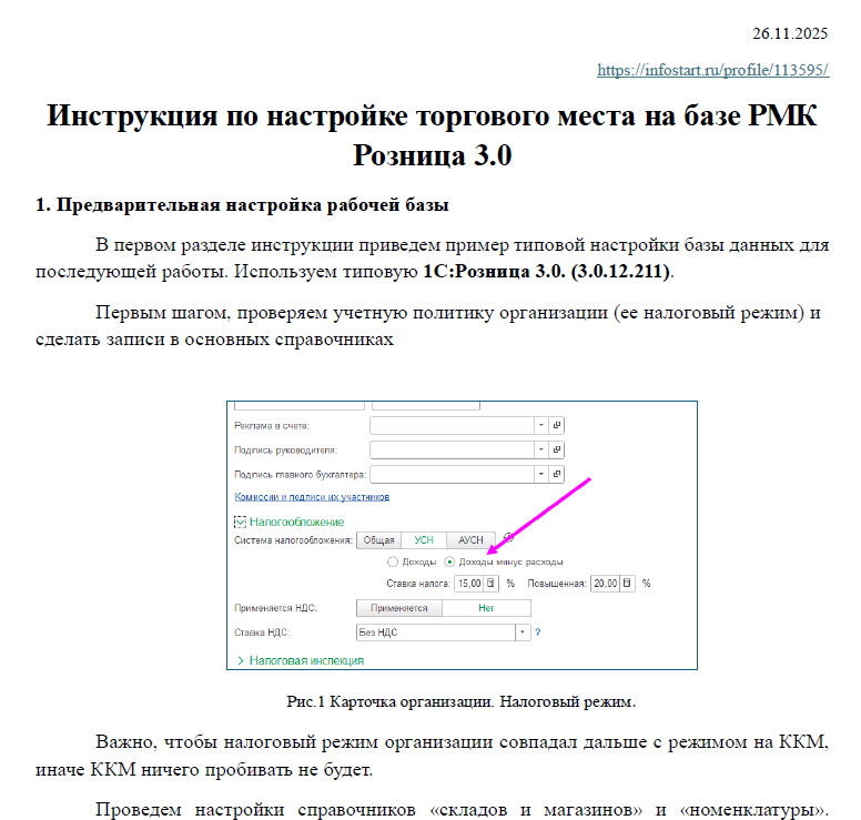 Что разобрано в данной версии инструкции? Затронуты вопросы от ввода начальной политики организации, настройка склада или магазина, проверки необходимых "параметров" номенклатуры, подключению торгового оборудования [ККМ (с драйвером АТОЛ), сканеров, эквайринга, дисплея покупателя) работа в РМК, проверка отчета розничных продаж по итогу.
