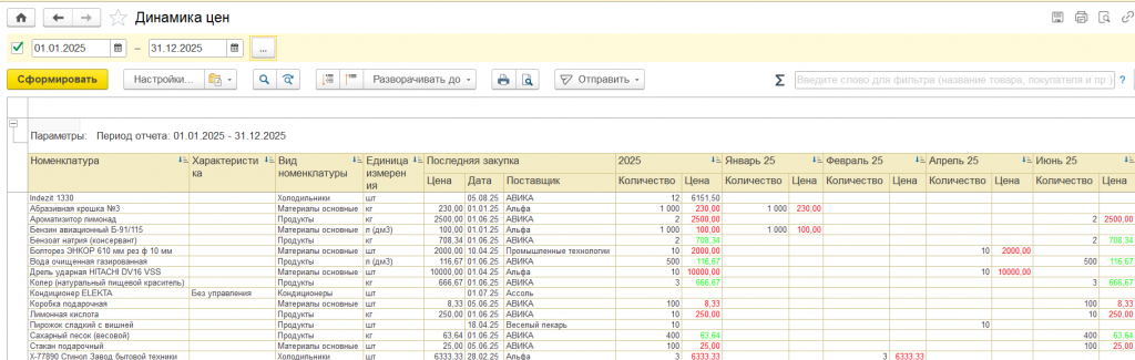 Отчет отображает средневзвешенные цены закупки по месяцам, выделяет цветом минимальную и максимальную за период отчета, отображает цену последней закупки и партнера.