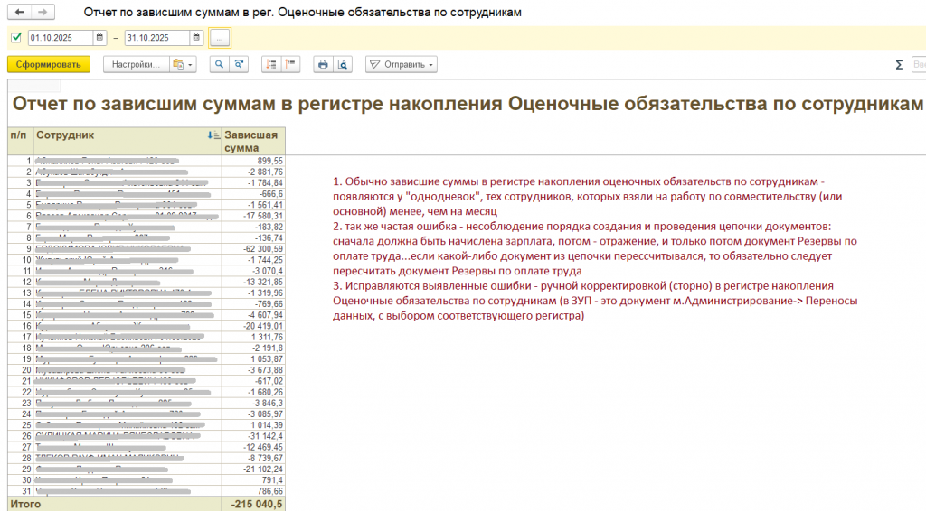 1. Обычно зависшие суммы в регистре накопления оценочных обязательств по сотрудникам - появляются у "однодневок", тех сотрудников, которых взяли на работу по совместительству (или основной) менее, чем на месяц
