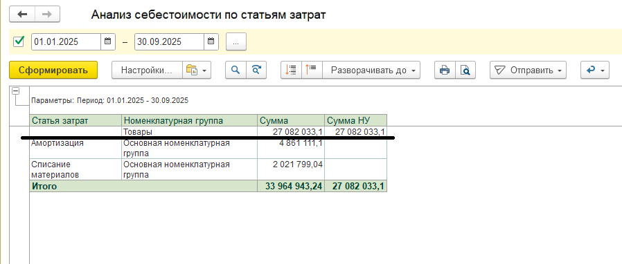 Также есть номенклатурные группы которые есть только в регистре "Хозрасчетный". В итоге в отчете будут записи с номенклатурной группой, но не заполненными статьями затрат: