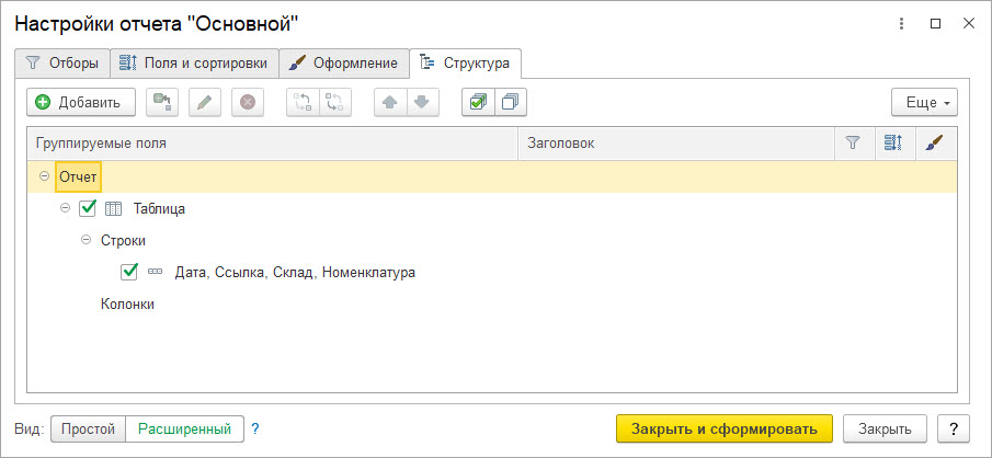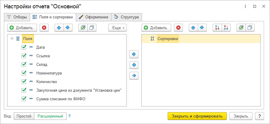 Финансистам потребовался плоский и без группировок отчет в ценах номенклатуры по документам "Внутреннее потребление товаров" с хозяйственной операцией "Списание на расходы / активы".