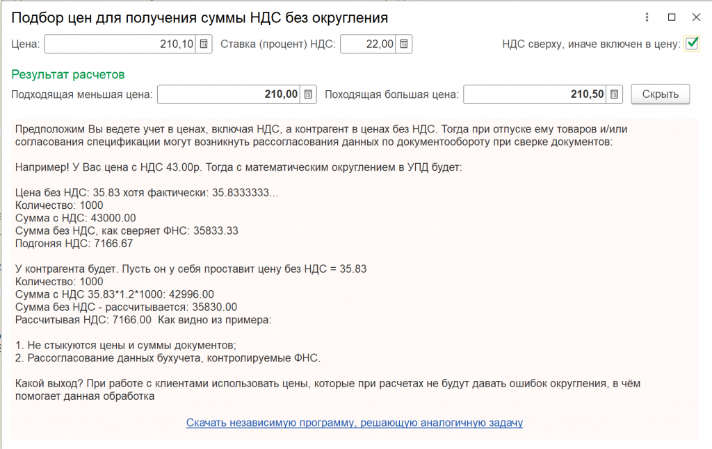 Обработка, помогающая назначать цены товаров, продукции, услуг не порождающих проблем с округлениями сумм из-за НДС, что уменьшает число инцидентов с клиентами