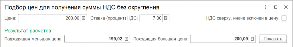 №2. Пусть наша цена 200 руб. включает НДС 7%, тогда цена без НДС будет 186.91588785046… и с клиентом не будет ничего стыковаться, да и по ЭДО такой документ не пройдет. Выход – использовать цену 199.02 (цена без НДС = 186р.) или например 200.09 (цена без НДС 187р.).