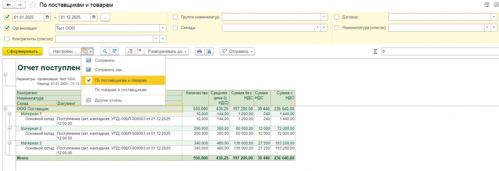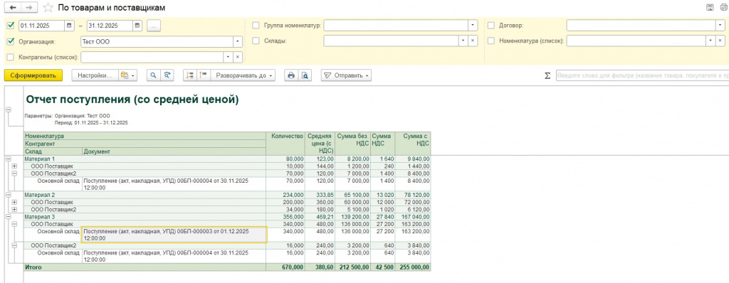 Отчет для анализа поступлений ТМЦ, основных средств, услуг от поставщиков с расчетом средней цены (с НДС).