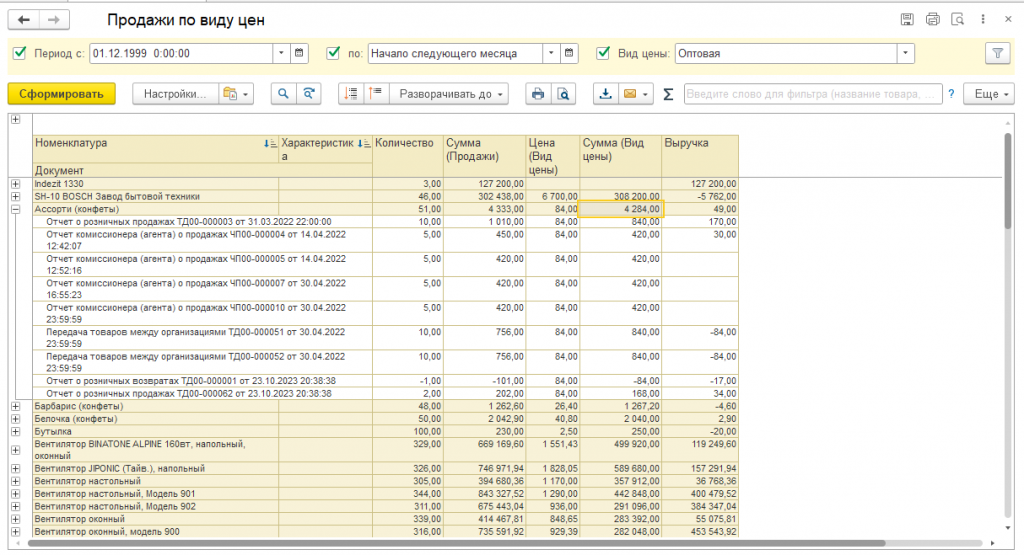 - Сумма (Вид цены), сумма проданного товара по виду цен.