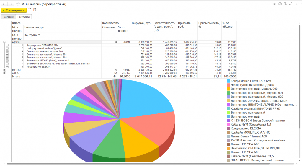 Отчет представляет возможность проведения динамического ABC анализа по регистру Выручка и себестоимость продаж, при этом он позволяет комбинировать различные группировки, например Номенклатура.Производитель, Номенклатура, Контрагент.Регион. При указании одного единственного поля группировки - вырождается в классический ABC-анализ.