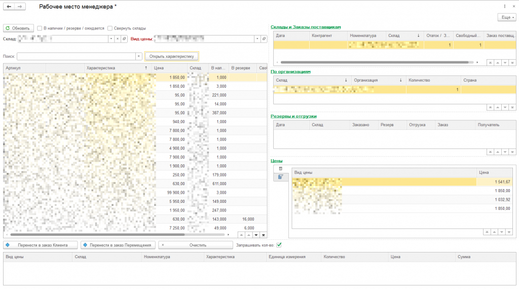 Можно видеть все цены, зарегистрированные по выбранному товару, а также его резервы остатки на организации и складу.