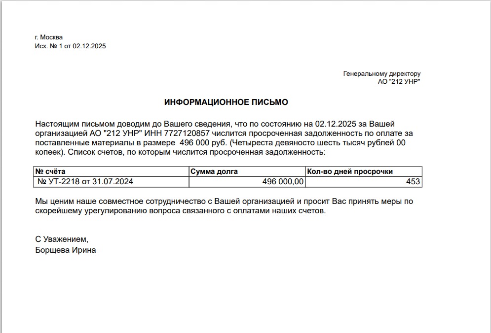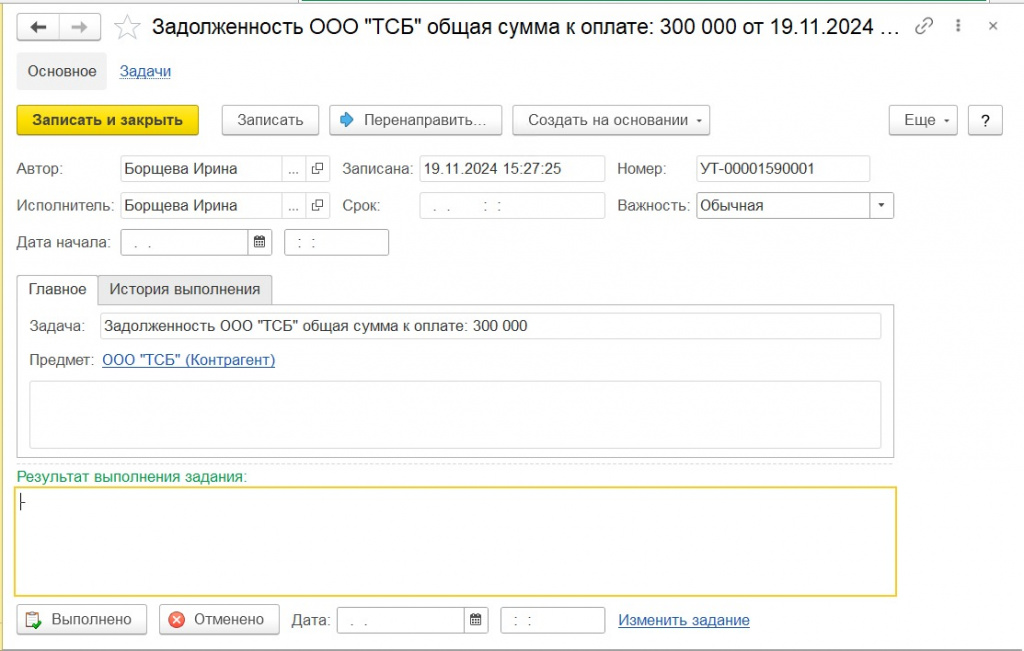 Обработка формирует задачи с информацией по задолженности клиентов, к задаче прикреплен pdf файл с суммой задолженности, количеством дней просрочки и номером заказа клиента.