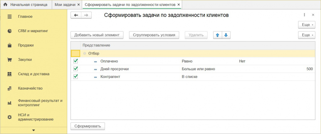 Формирование задач по задолженности клиентов