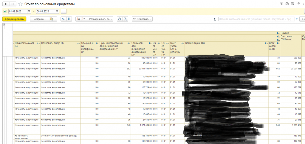 - СуммаАмортБУ (амортизация на конец периода в БУ),