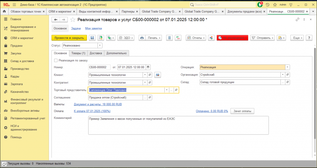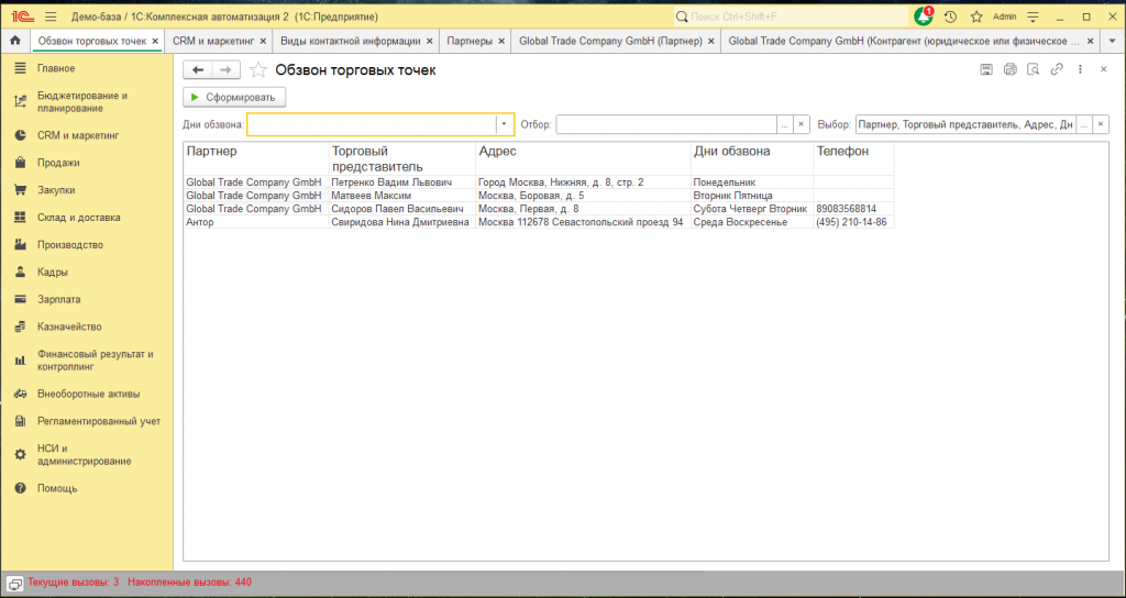 Расширение позволит добавлять контрагентам и партнером в адреса торговых представителей и дни обзвона, с помощью отчета можно контролировать, какой торговый представитель отвечает за торговую точку. В документе "Реализация товаров" добавлено поле "Торговый представитель" для использования в отчетах.