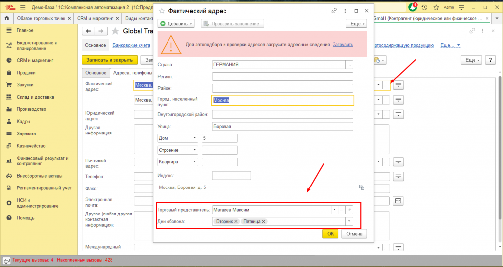 После добавления расширения у контрагентов и партнеров при добавлении адреса можно указать торгового представителя и дни обзвона торговой точки.