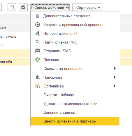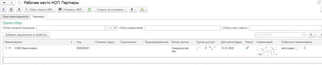 Внешняя обработка предназначена для лица, ответственного за клиентов, например, начальника отдела продаж (НОП). Она позволяет распределить по ответственным менеджера партнеров.