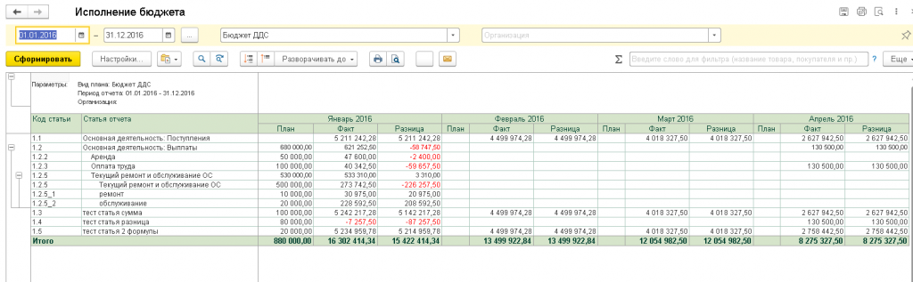 В отчёт за выбранный период в разрезе месяцев выводятся плановые и фактические суммы в разрезе статей бюджета: