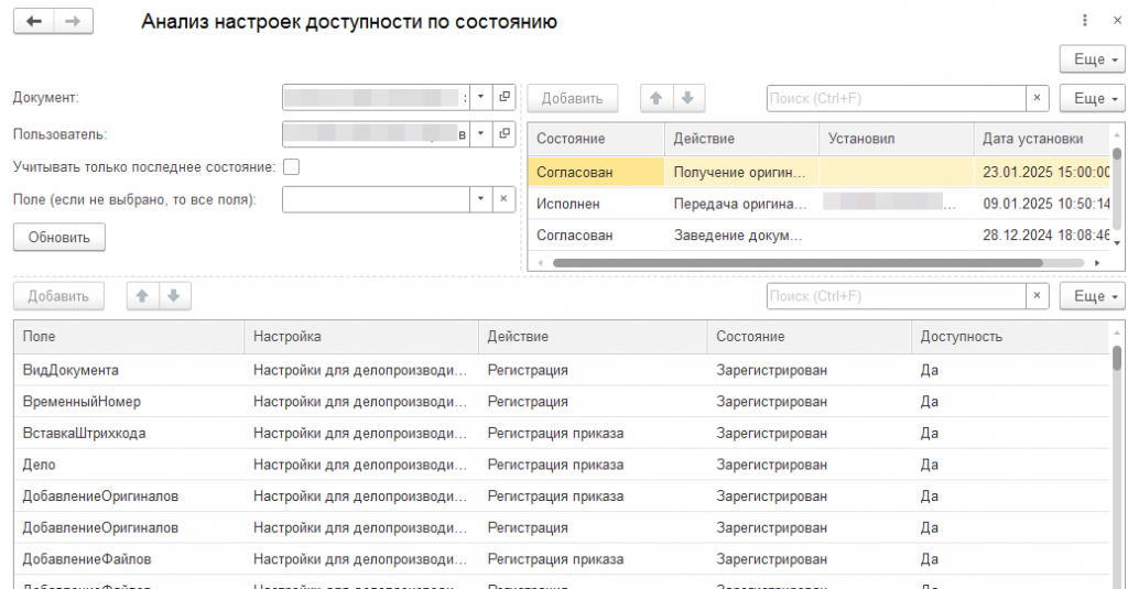 В левой верхней части выбираем документ и пользователя, для которых нужно показать применимые настройки состояния. Также можно при расчете настроек состояния учитывать только последнее состояние документа, для этого есть соответствующий флажок. Также, если нас не интересуют все поля, можно указать конкретные поля документа.