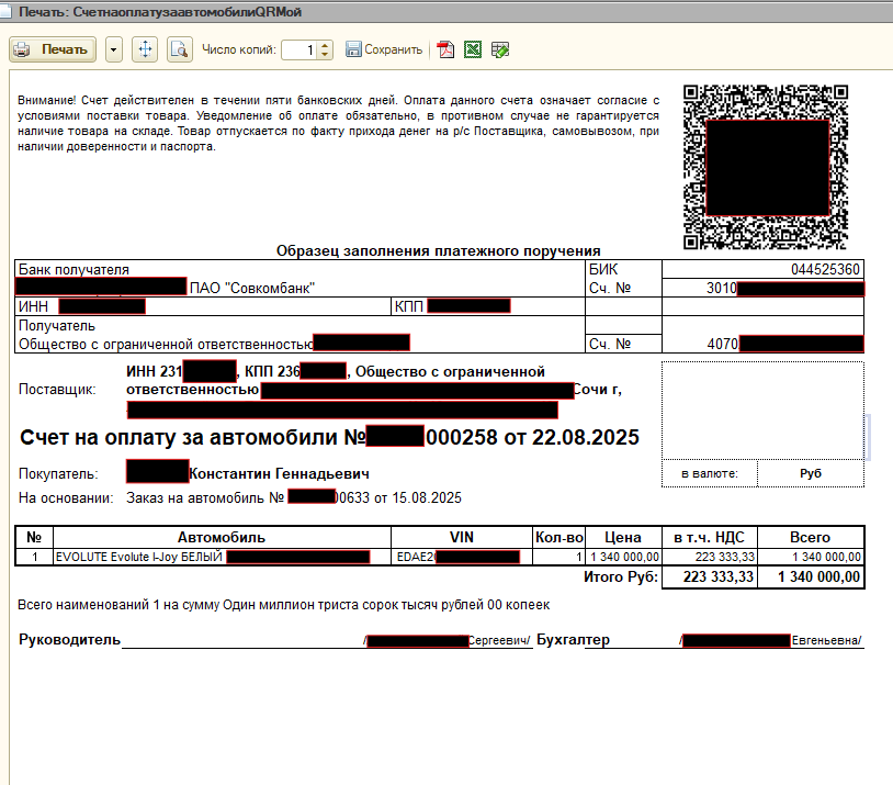 Счет на оплату за автомобили с QR-кодом для оплаты через приложения банков. Для Альфа-Авто:Автосалон+Автосервис+Автозапчасти 4.1 (4.1.01.27).