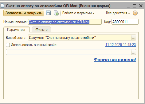 Печатная форма Счет на оплату за автомобили с QR подключается в Альфа-Авто 4.1 через встроенный механизм подключения внешних печатных форм.
