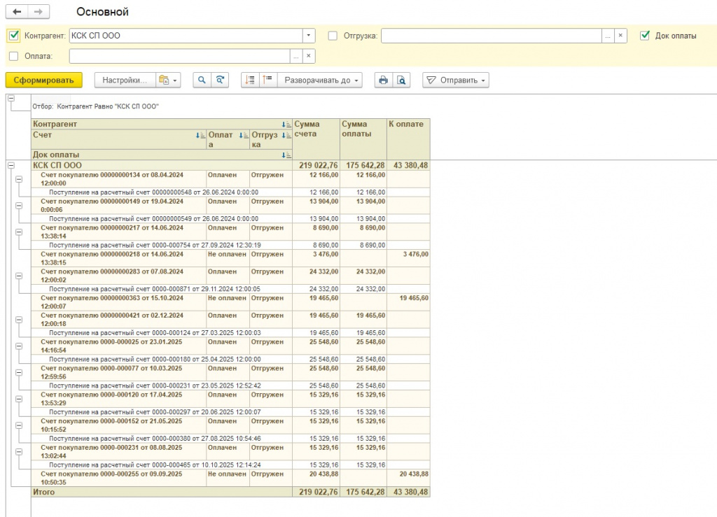 Позволяет отобрать счета по статусам оплаты и отгрузки в любых сочетаниях.