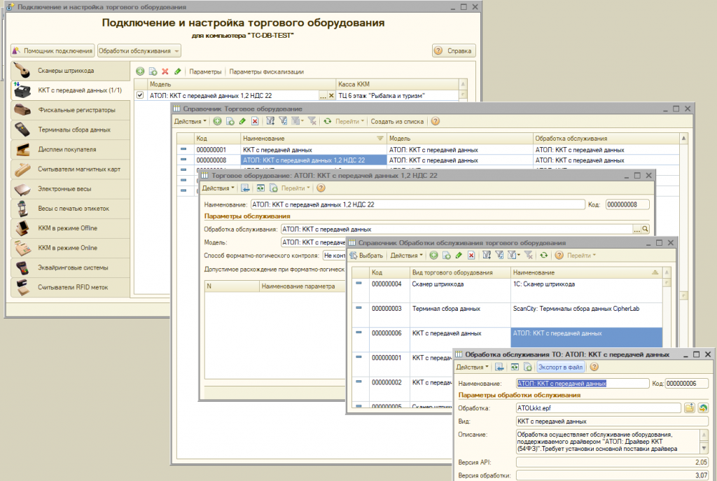 Универсальная обработка для обслуживания любых фискальных регистраторов (ККТ), в том числе Веб сервер АТОЛ. Работает в соответствии с 54-ФЗ. (ФФД 1.0, ФФД 1.05, ФФД 1.1, ФФД 1.2). Подключайте любую онлайн кассу к практически любой конфигурации на обычных формах. Нет необходимости обновлять 1С. Можно бесплатно скачать и протестировать. Может работать одновременно с несколькими онлайн-кассами, либо одной с разных рабочих мест. (через RDP, TCP\IP или веб-сервер) Позволяет разделить один чек сразу на несколько ККТ или на несколько систем налогообложения. Поддерживает разрешительный режим и маркировку. Поддерживает локальный модуль честного знака для офлайн проверки. Можно настроить собственный шаблонов чека. Можно использовать эквайринг там, где он не поддерживается. Работает на LINUX и Windows Адаптировано к ставке НДС 22% и ТС ПИоТ.