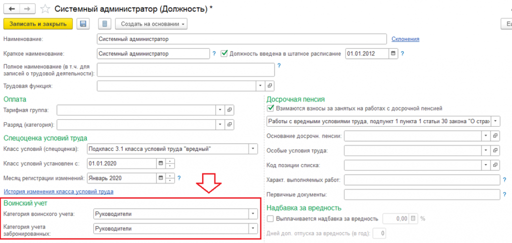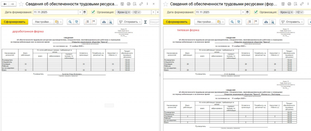 Данные берутся из карточки Должности и данных воинского учета сотрудников.