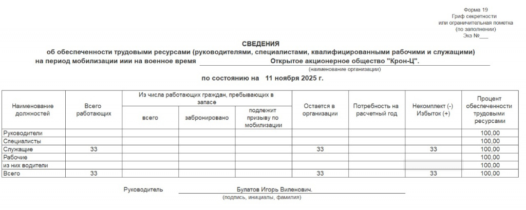 - Потребность на расчетный год: Планируемая потребность в персонале для обеспечения деятельности в военное время (обычно рассчитывается как 80% от общего числа работающих).