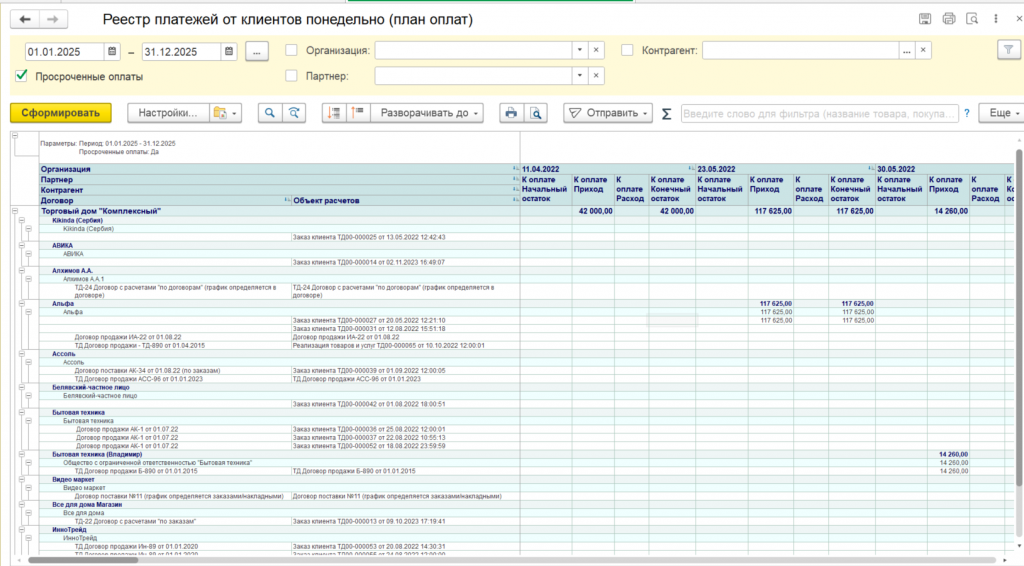 Вариант «Реестр платежей от клиентов понедельно (план оплат)».