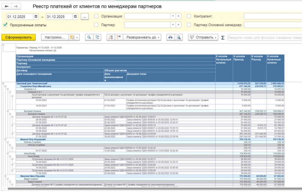 Управленческий разрез «по менеджерам партнёров»: видно, у кого из менеджеров какие суммы «висят» и где требуется контроль;