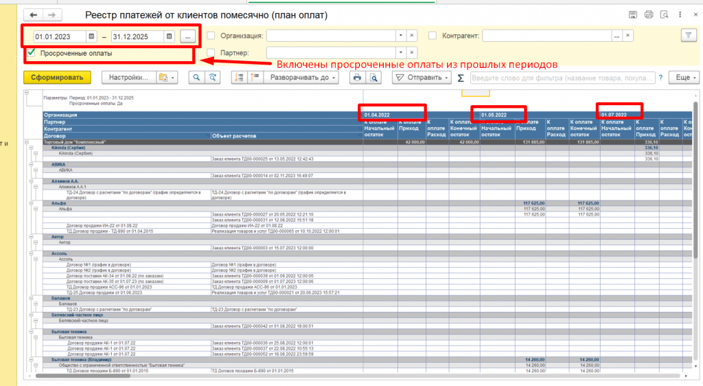 Контроль просрочки без «провалов»: опция «Просроченные оплаты» позволяет включать/исключать задолженность из прошлых периодов в выбранный интервал;