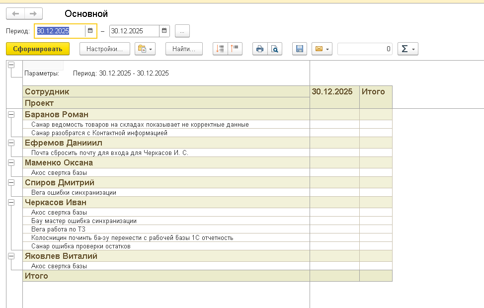 • Детальная аналитика по задачам, сотрудникам и проектам за период.