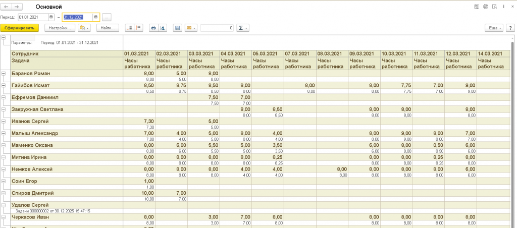 • Видно: по какой задаче, по какому сотруднику, в какие дни было отработано время.
