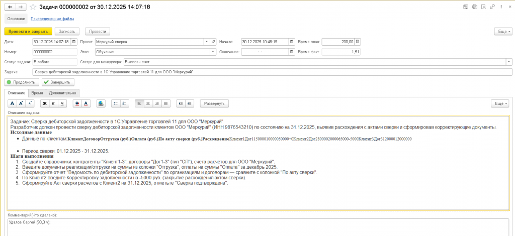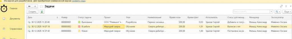 • Интеграция задач с проектами, заказчиками, этапами и договорами.