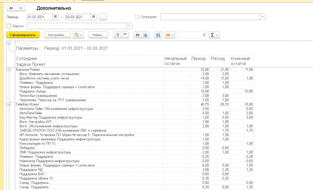 • Остатки и обороты часов: сколько было, сколько потратили, сколько осталось.
