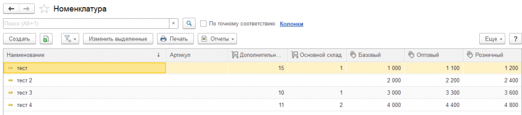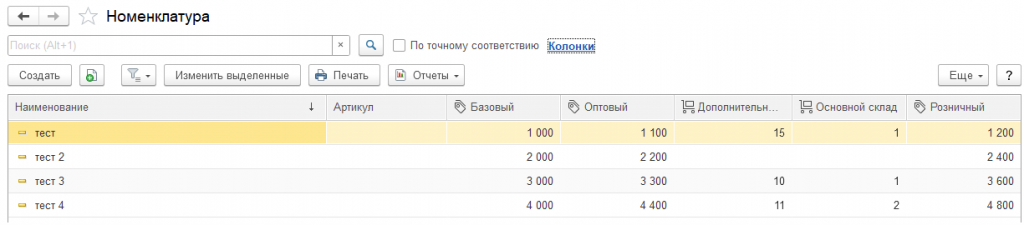 Реализованы возможности вывода дополнительных колонок складов и видов цен для просмотра актуальных остатков и цен номенклатуры.