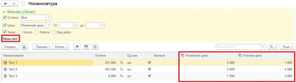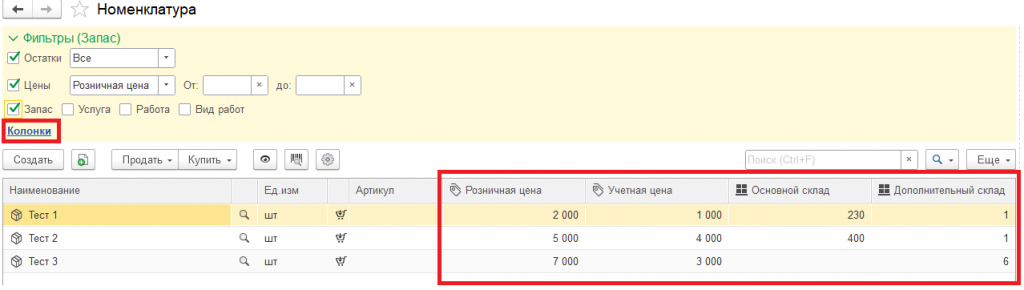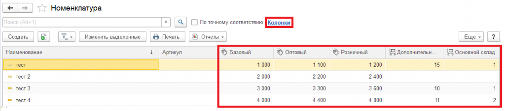- Добавлена гиперссылка "Колонки" для настройки отображаемых складов и видов цен, а также выведены колонки с актуальными значениями выбранных видов цен. Колонки видов цен от колонок складов отличаются иконкой.