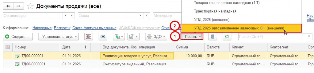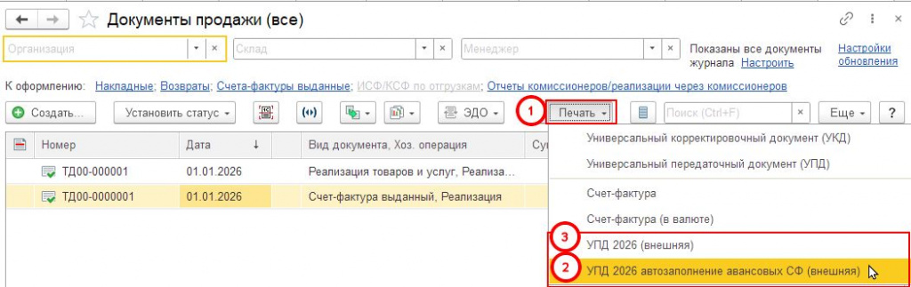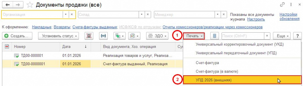 4. В меню "Печать" выбираем печатную форму "УПД 2026 (Внешняя)" (рис. выше)