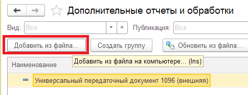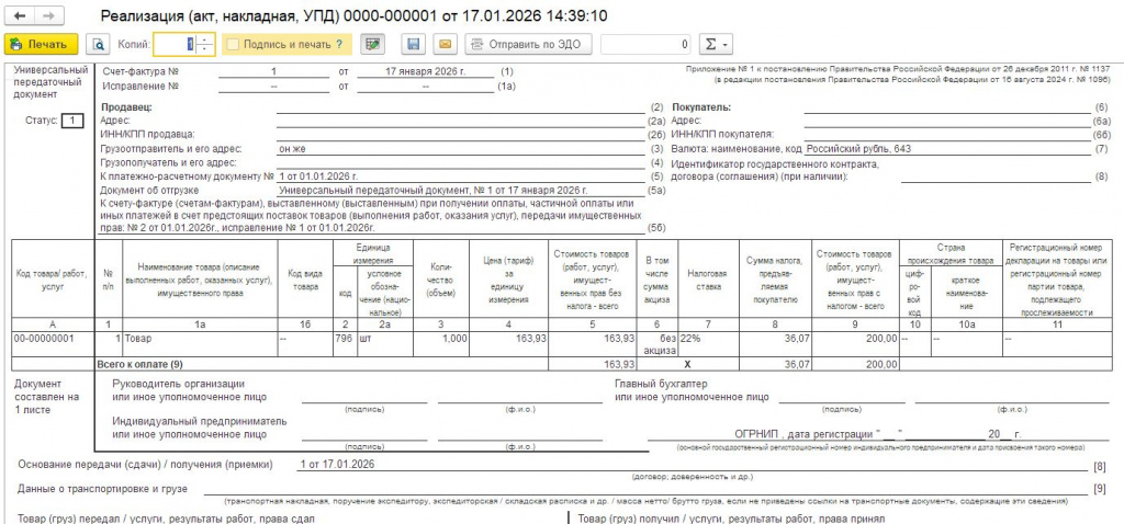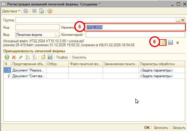 2. Загрузить печатную форму в 1С (инструкция ниже). При этом у документов "Реализация товаров и услуг" и "Счет-фактура выданный" добавится печатная форма "УПД 2026 (внешняя):